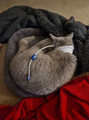 Throughout the two weeks, the vets prescribed treatment requiring 24-hour care. The treatment consisted of her owners having to tube feed Sasha and steroid treatment for suspected inflammarory bowel disease. This treatment alone resulted in a vet bill of £2,560. On 08.01.2023, unfortunately, Sasha's tube came out (the stitches were attached to a scab from the surgery, which over time had grown loose). This resulted in Sasha requiring emergency treatment to reinsert the tube at an additional £565.