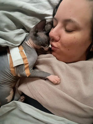 On May 6th Satoshi woke up acting different. She had diarrhoea, threw up and was suddenly disinterested in her food. We immediately rushed to the vet. At first we thought it was a stomach bug, but by Sunday Satoshi was lethargic and losing weight. We had her on an intravenous drip, as well as glucose and antibiotics. She was positive for FCov, but she had no symptoms of FIP - her blood work was normal.